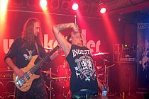 ![]() Nach den regelmäßig veranstalteten „Darkscene Metal-Parties“ und vergangenen Live-Gigs mit Bands wie Vicious Rumors, Helstar oder den Billion Dollar Babies ging die Kooperation des Weekender Clubs mit Darkscene am Samstag, den 25.11.2011, in die nächste Runde. Niemand geringerer als die heimische Top-Truppe Lost Dreams konnte verpflichtet werden, um ihre CD-Release Show fürs neue, bärenstarke, über Twilight Records veröffentlichte Album "Blinded By Rage" (zum Review…) in den chilligen Weekender-Räumlichkeiten abzuhalten. Als Support fungierten die Italiener Outcry. Zusätzlich durften die heimischen Youngsters von Kataplexie versuchen, das doch recht zahlreich erschienene Publikum von ihren Qualitäten zu überzeugen. Der eine oder andere Darkscene-kundige Leser wird sich vielleicht grübelnd an der Unterlippe zupfen und die berechtigte Frage aufwerfen, warum vom guten Dutzend der DS-Schreiberlinge gerade der eher krawallempfindliche Hollywood-Korrespondent zur Berichterstattung dieses deftigen Paketes abkommandiert wurde? Nun ja, entschuldigt durch X-Mas-Feiern/Schönheitsoperationen/allgemeinem „Couch Potato-ismus“/zu tiefen Außentemperaturen oder sonstig bedingten Verhinderungen bleibt eben nur mehr meinereiner übrig, um diesem absoluten Muss-Event beizuwohnen und eines kann ich gleich vorweg nehmen – die Veranstaltung war großartig und machte einen Riesenspaß. Punkt 20.45 enterten Kataplexie die Bühne, um den Anwesenden Kostproben ihres brandneuen Albums "One More Drink For My Collapse" zu kredenzen. Die 35-minütige Vorstellung des blutjungen Innsbrucker Quintetts, die zudem das Live-Debüt des neuen Fronters David Burtscher darstellt, darf als durchaus gelungen bezeichnet werden. Natürlich merkt man recht schnell, dass es der Truppe noch an nennenswerter Live-Erfahrung fehlt, was sich speziell in der nicht existenten Bühnenshow der vier Instrumentalisten der Combo deutlich manifestiert. Mit Ausnahme des erfreulich agilen Neo-Sängers, der ganz offensichtlich alle Anlagen für eine zukünftige „Rampensau“ besitzt, beschränkt sich das „Stage-Acting“ der restlichen Akteure lediglich aufs „Schwitzen“. Das sei der Band auf der momentanen Sprosse der Karriere-Leiter aber definitiv verziehen, kann man das Publikum mit relativ abwechslungsreichen, dynamischen Kompositionen doch recht gut unterhalten und zeigt ohne Zweifel, dass die Band Potenzial für mehr besitzt. Daumen hoch. Outcry aus Trient gehen im Anschluss ob des gut 10 bis 15 Jahre höheren Durchschnittsalters ganz klar schon eine Portion routinierter und homogener ans Werk. Und obwohl die Herrschaften handwerklich durchaus Qualitäten besitzen und diese auch zu beweisen vermögen, langweilt die Chose aber trotzdem recht schnell auf Grund der totalen und gnadenlosen Austauschbarkeit des Songmaterials, dessen Stilistik die Herren selbst als „Death Metalcore“ bezeichnen. Das absolute Negativ-Highlight dieser Truppe sind die cleanen „Gesangspassagen“ (ganz bewusst in Anführungszeichen gesetzt) des Herren Steve Haze am Mikro. Heilige Dissonanz!!! Da würden sich meine Zehennägel sogar noch durch Stahlkappen-Boots aufbiegen. Dermaßen viele penetrant falsche Töne hört man ansonsten eigentlich nur in den „Leider nein“-Einblendungen diverser Casting-Shows… na ja, Schwamm drüber! Aber egal, der Punkt der Tagesordnung, wegen dem 99% der Anwesenden gekommen waren, steht nun bevor und eines wird schon nach kurzer Zeit augenscheinlich. Die Herren Traunig, Maierhofer, Sopracolle, Hormann und Peychär strotzen nur so vor Selbstvertrauen und man sieht ihrer mit breiter Brust vorgetragenen Performance zu jeder Sekunde die ungemeine Professionalität an, die sich Lost Dreams in den letzten Jahren durch ausgiebiges Touren (u.a. mit Six Feet Under und Illdisposed) erspielt haben. Gute 70 Minuten dauert der perfekte Melodic Death Metal-Vortrag der Tiroler, der von Songs des brandneuen "Blinded By Rage" Albums und Liedmaterial vom Vorgänger "Wage Of Disgrace" (zum Review…) dominiert wird. Hier an dieser Stelle einzelne Songs herauszupicken, macht gar keinen Sinn, denn als objektiver Beobachter kann – nein – MUSS man, ohne dabei jeglichen Lokalpatriotismus in die Waagschale werfen zu müssen, ganz einfach konstatieren, dass bei dieser Band das gesamte Paket zu 100% stimmt. Das ausgeklügelte Songmaterial, die souveräne Live-Präsentation, die handwerklichen Fähigkeiten – die Herrschaften agieren absolut in jeder Hinsicht auf internationalem Level. Erstaunlich wie arschtight und auf die Zehntelsekunde präzise sich die Rhythmusfraktion durch die Prärie pflügt und damit die Basis für die mehr als solide Gitarrenarbeit des Klampfen-Duos legt. Und wenn man dann obendrein wie im Falle von Lost Dreams noch einen charismatischen jungen Frontman besitzt, der dieser Bezeichnung mit seinem Stage-Acting auch gerecht wird und darüber hinaus mit seiner Stimmband-Power jeden letzten minimalen Funken an Provinzialität abzutöten vermag, dann besitzt man als Band alle Voraussetzungen zum Erfolg. Das Publikum bedankt sich für die großartige Vorstellung an diesem Abend mit großem Applaus und schickt den heimischen Fünfer mit dem an diesem Abend vorgestellten neuen Album "Blinded By Rage" im Gepäck hinaus in die große weite Welt, um die Erfolge einzufahren, die sich diese Band verdient hat. Denn ganz ehrlich, die Anzahl an Festivalbühnen, auf denen Lost Dreams in dieser Verfassung keinen Platz hätten, die ist nur mehr ganz spärlich.Setlist – Lost Dreams - 25.11.2011 – Weekender/Innsbruck Living In The Mass Painted Man Fear Me Fall Of The World Medley (Evil Unleashed/Silent Mayhem/XTC In Blood/Infernal Voices) Demons Call My Name I Curse You Wage Of Disgrace Death Machines Secrets Dust To Dust Loco Motive |