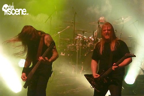 Das schmucke Münchner Kesselhaus wird heute aus allen Nähten platzen. Amon Amarth ziehen die Metal Massen und jeder der die Schweden jemals live erlebt hat, der weiß auch warum. Auf die Wikinger ist Verlass. Sie sind einer der besten Liveacts unserer Zeit und weil das Vorprogramm dieses Packages mit den bärenstark zurückgekehrten Carcass und meiner großen Sünde Hell sowieso ein absoluter Genuss ist, sollte die heute Abschlusskonzertreise des Jahres 2013 ein wahrer Wonnepfropfen werden. ![]() Hell Nach einem Vierteljahrhundert intensivster Konzertgenüsse ist der geeichte Metalhead keineswegs mehr so leicht aus der Reserve zu locken, oder gar nervös zu machen. Verdammte scheiße, ich habe ja wirklich geglaubt abgebrüht zu sein, aber schon eine halbe Stunde vor stage-time der Briten nerve ich mein Gefolge mit meiner Aufregung und Unruhe. Wenn ich Hell höre und die Chance habe die meines Erachtens beste Metal Band der Neuzeit ein weiteres Mal live zu erleben, steigt die Vorfreude einfach ins Uferlose. Beinahe nervös kämpft man sich in die ersten Reihen um das Schauspiel der fünf Zombies aufzusaugen und spätestens wenn Zeremonienmeister Dave Bower nach Rainbow's "Long Live Rock N Roll" und dem düsteren "Gehennae Incendiis" Intro zu "The Age Of Nefarius" auf die Bühne stapft, um seine theatralische Theater-Show abzuliefern, stehen mir gleich wieder die Nackenhaar stramm, wie einem Kleinkind vorm Christbaum. Herrlich! Dieser, im normalen Leben durch und durch als perfekter britischer Gentlemen zu beschreibende Mann ist auf der Bühne ein Freak und es passt wie die Faust aufs Auge, dass er mir nach der Show im Backstage Raum von seiner jahrelangen Shakespeare-Vergangenheit erzählt, die ihn mittlerweile an den Punkt gebracht hat, dass er zu alt für den Romeo und zu jung für den Tod ist, weshalb er sich umso intensiver auf Hell konzentrieren kann. Hell sind heute neuerlich zutiefst beeindruckend und ihre Aura magisch. Der Sound ist gottlob von Beginn an richtig klasse und monströs fett. Das Duo Sneap/Bower kredenzt seine grandiosen Gitarrenbreitseiten in vollstem Volumen und R.J.Dio-Zombie Tony Speakman malträtiert seinen Bass in stoischer George A. Romero-Akrobatik. Die Gitarren schnalzen uns nur so um die Ohren. Die Bühne ist wieder mal einem düsteren, mittelalterlichen Horrorszenario nachgestellt, die Atmosphäre sakral und so dicht wie möglich und (im Gegensatz zurAccept Tour, wo die Briten offensichtlich bewusst runtergedreht wurden) stehen Hell heute nicht nur die volle Soundwand, sondern auch eine massive Lightshow zur Seite. Optisch und musikalisch ist zum Glück sowieso alles beim Alten bei Hell und die Briten markieren mit ihrem bewährten Live-Spektakel und ihren unfassbar geilen Songs einmal mehr ein absolutes Highlight. ![]() "The Age Of Nefarius" stellt sich wie erwartet als perfekter Opener vor. Die Bühne ist in düster blaues Licht und Nebel getaucht, als dieser neue Klassiker auch jene an den Eiern packt, die Hell noch nicht kennen. Die große Kunst, die diese Band livehaftig vollbringt ist so intensiv und beeindruckend, dass sie damit auch Menschen zu überzeugen und zu faszinieren weiß, die bislang nicht an die "Church of Hell" geglaubt haben. Das Livespektakel der fünf Briten ist einfach zu verführerisch und imposant, um nicht davon begeistert zu sein. Man steht im Bann der Musik und der Aura von Dave Bower, wenn "On Earth As It Is In Hell" seine Größe offenbart. "Your blasphemy will be undone, the day you hail the darkest one" "Blasphemy And The Master" ist einmal mehr der intensivste Teil des Spektakels. Dave verfällt seiner inbrünstigen Selbstgeißelungsperformance, bevor er den ersten Reihen den Teufel auszutreiben versucht. Was dieser Mann auf der Bühne transportiert ist schier unglaublich. Man merkt ihm seine jahrelange Theatererfahrung zu jeder Sekunde an. Er geht in seiner Rolle auf und stapft über die Bühne, als wäre er von Dämonen besessen. Jeder seiner Blicke ist zutiefst ergreifend und seine Dynamik ist das Maß aller Dinge und die perfekte Ergänzung zur schön choreografierten Performance der drei Gitarristen. Mit "Something Wicked This Way Comes" kommt dann leider nur noch ein weiterer neuer Song zu seiner Livepremiere und wie erwartet besteht dieses extrem heavy tönende Manifest mit seinen fetten Gitarrenwänden die Taufe mit Bravour. ![]() Dass der Auftritt von Hell natürlich wieder mal viel zu kurz geraten würde, war zu schon im Vorhinein klar. Sechs Songs, davon leider nur zwei neue Hämmer von "Curse & Chapter" (zum Review) und vier unbändige Hits von "Human Remains" (zum Review) sind eine Schande und einfach viel zu wenig. Dass dann auch noch ein neuer Übertrack wie "Darkhangel" nicht den Weg in den Set findet, ist beinahe eine Todsünde. Natürlich sind auch all die anderen Songs makellos, aber auf dieses epische Highlight verzichten zu müssen, ist ein Frevel. Das grandiose "The Quest" und der earcatcher "Save us From Those Who Will Save Us" beschließen dann die nur knapp 30 Konzertminuten und lassen die bereits von Beginn der Show an richtig gut gefüllte Halle mit staunenden Mäulern zurück. Es war einmal mehr der erhoffte und erwartete Genuss. Das absolut komplette Live-Spektakel das Hell von der Optik über die Theatralik bis zur Musik immer wieder aufs Neue präsentieren sucht Seinesgleichen beinahe vergeblich und genau mit diesem großartigen Gesamtkonzept werden es die Briten immer wieder schaffen, auch jene für ihre Auftritte zu begeistern, die sich nicht unbedingt als die-hard Fans ihrer Musik bekennen. Unsereinem lässt eine Performance der fünf Herren ohnehin immer wohlige Schauer der Befriedigung über den Rücken kullern und somit wollen wir am Ende, trotz eines weinenden Auges über die kurze Spielzeit daran erinnern, dass Zufriedenheit eine Tugend ist: Lieber eine so intensive und geniale halbe Stunde Hell als stundenlange Auftritte anderer Bands. Es war grandios! Dass wir mit Kev Power und den